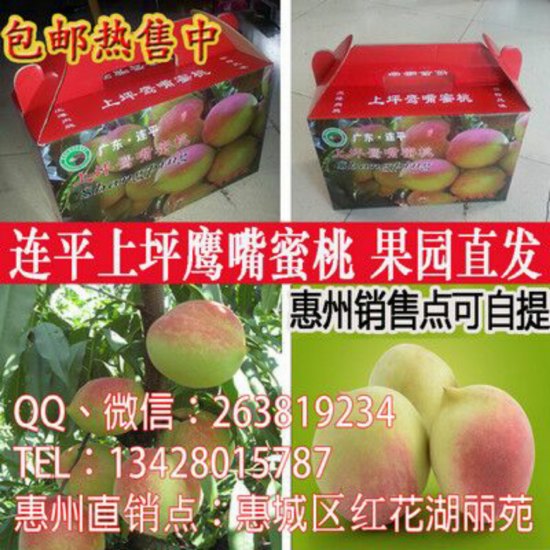 河源市连平县“上坪鹰嘴蜜桃”以其色泽鲜亮、果大肉嫩、味甜爽脆闻名,远销珠三角大中城市,声名日隆,供不应求,已经成为广东地区最受消费者欢迎的“绿色水果”之一。2005年11月,连平县被中国特产之乡推荐暨宣传活动组织委员会确认为“中国鹰嘴蜜桃之乡”。 “上坪鹰嘴蜜桃”是目前广东乃至中国南方最好的桃类品种,被农科专家誉为“桃之极品”。上坪水蜜桃基地出产的蜜桃果大形美,肉质脆嫩,清甜爽口,是不可多得的水果精品, <\/strong>